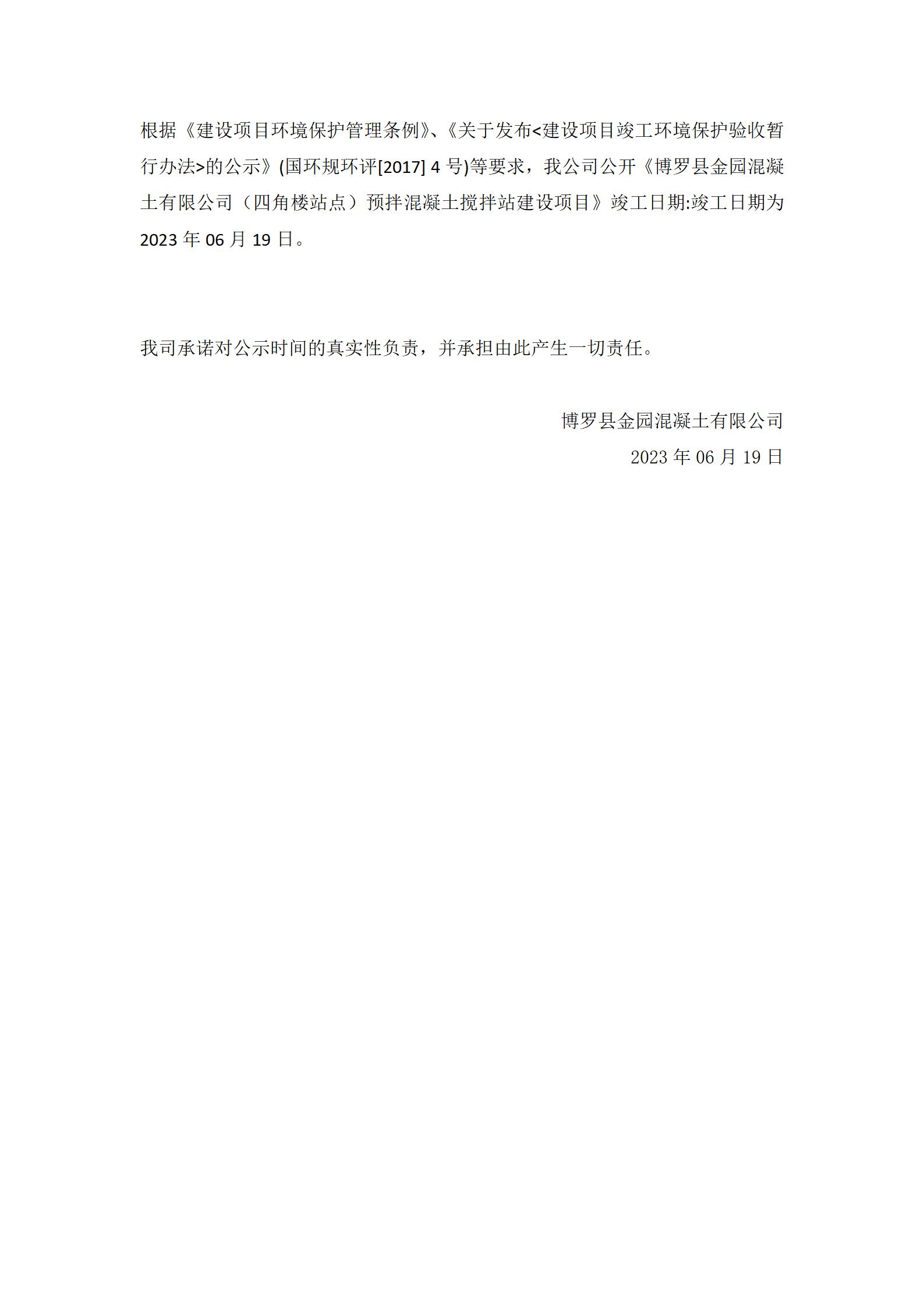 博罗县金园混凝土有限公司(四角楼站点)预拌混凝土搅拌站建设项目竣工时间公示