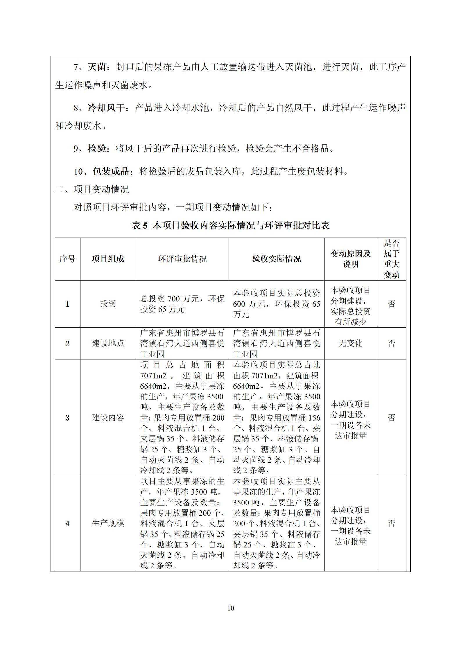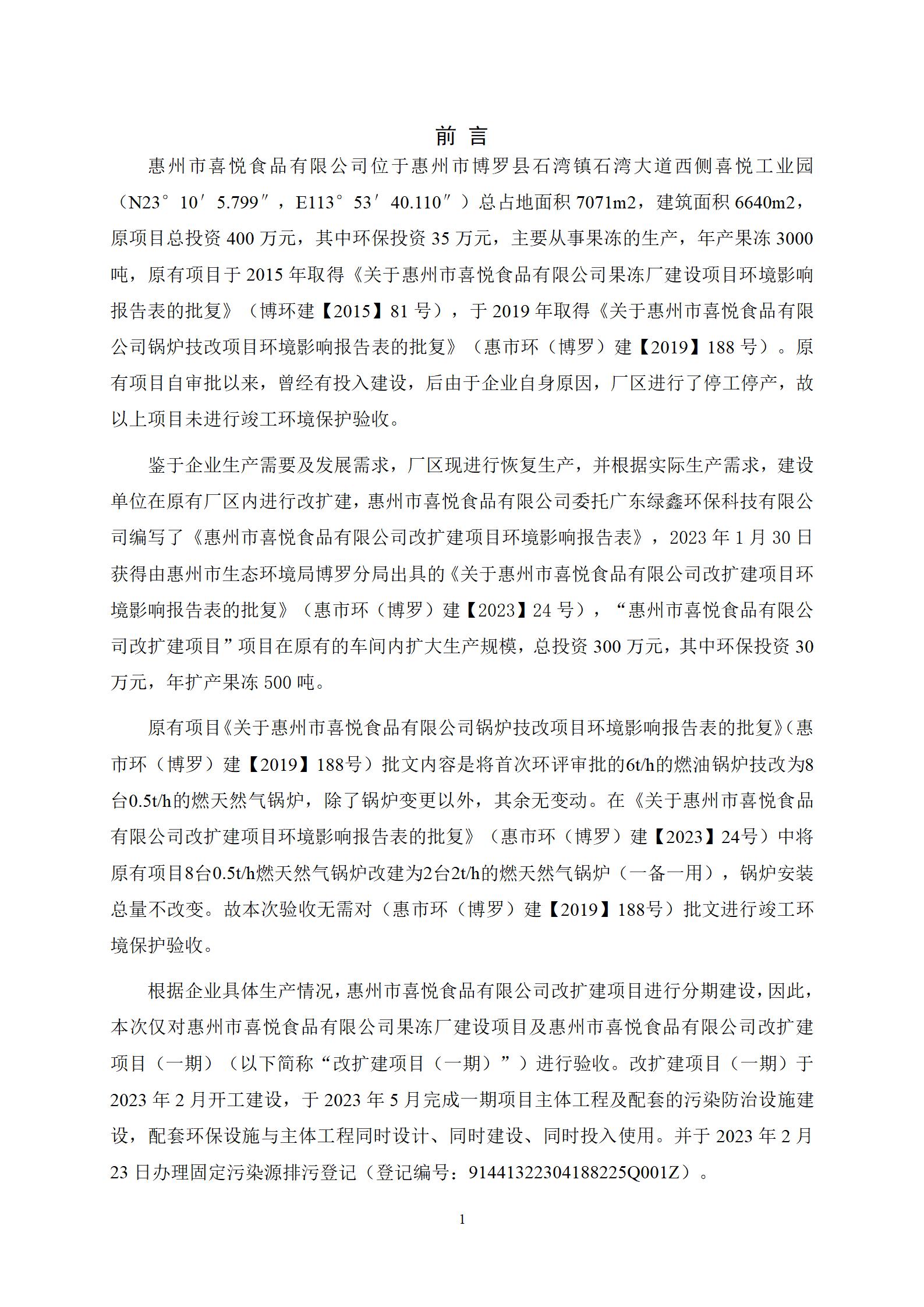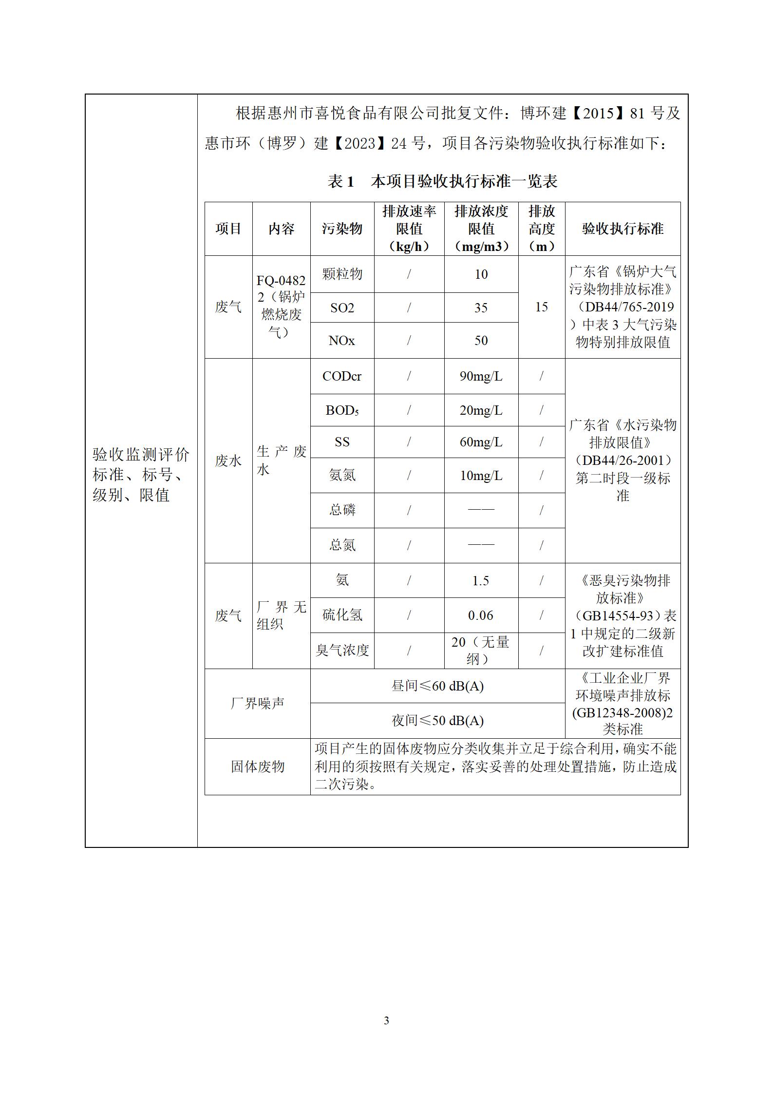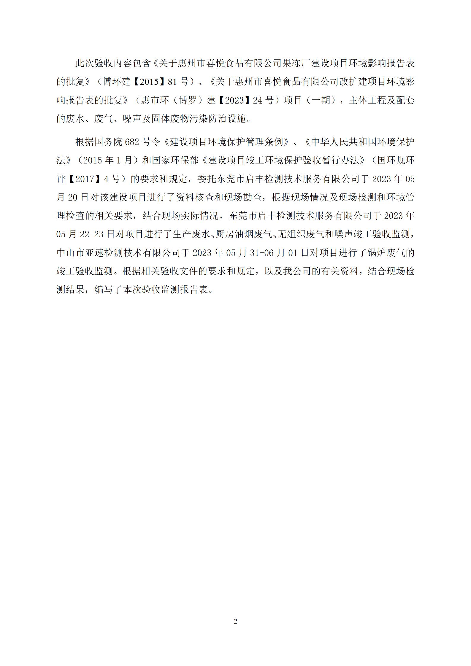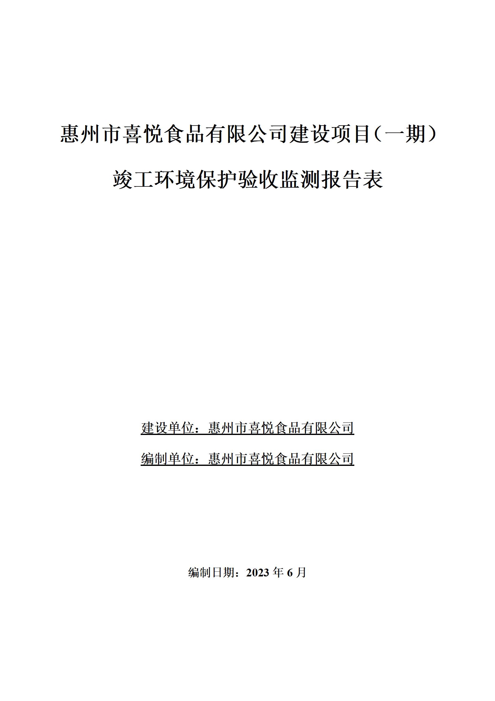 惠州市喜悦食品有限公司建设项目(一期) 竣工环境保护验收监测报告表