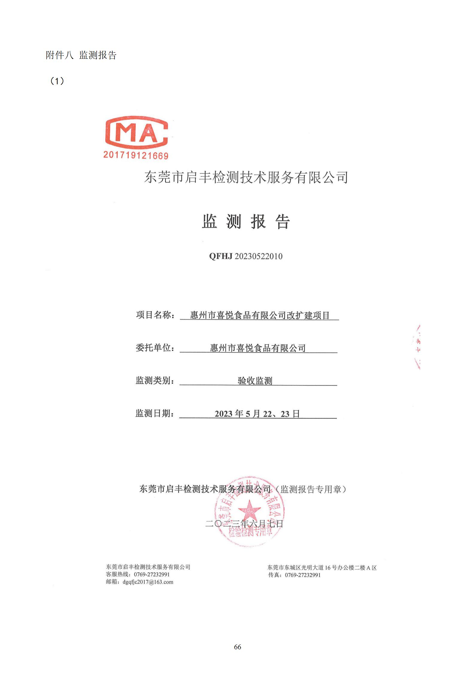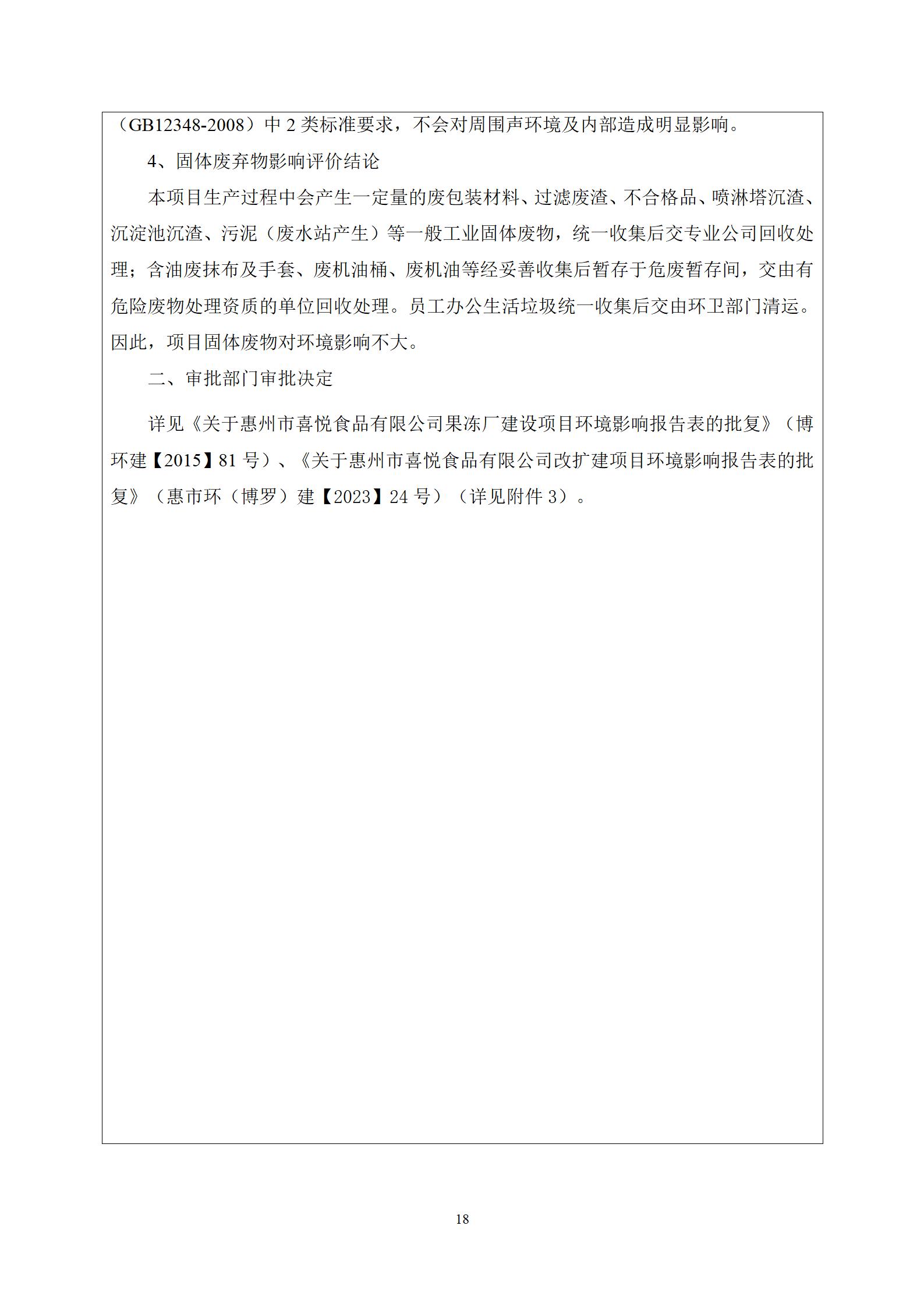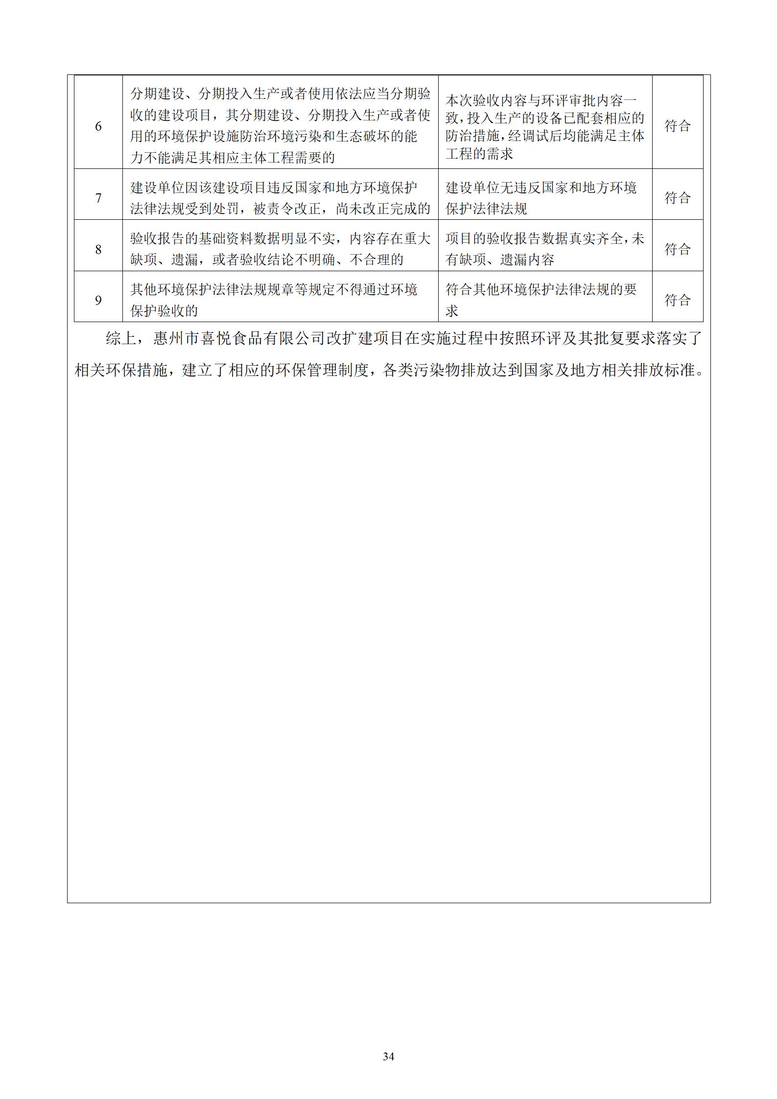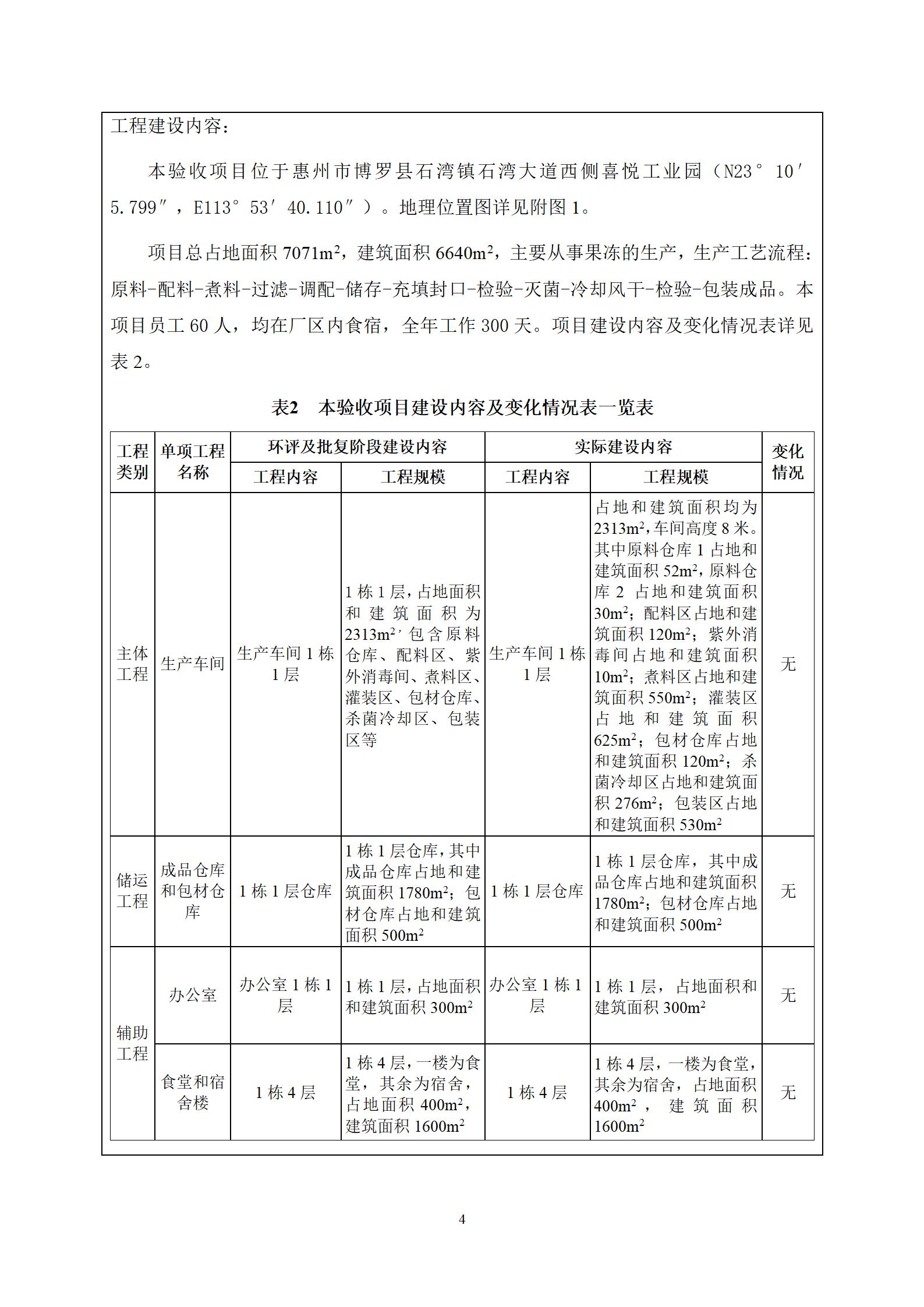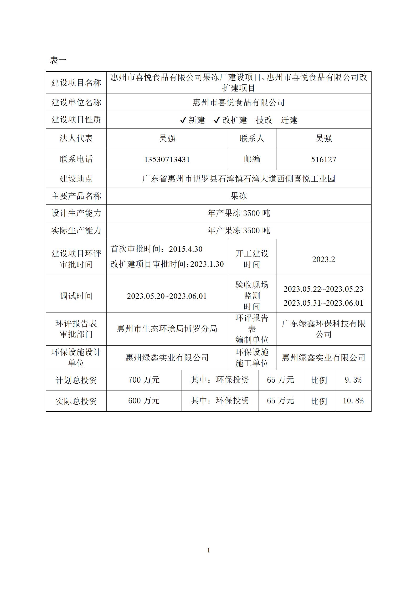 惠州市喜悦食品有限公司建设项目(一期) 竣工环境保护验收监测报告表