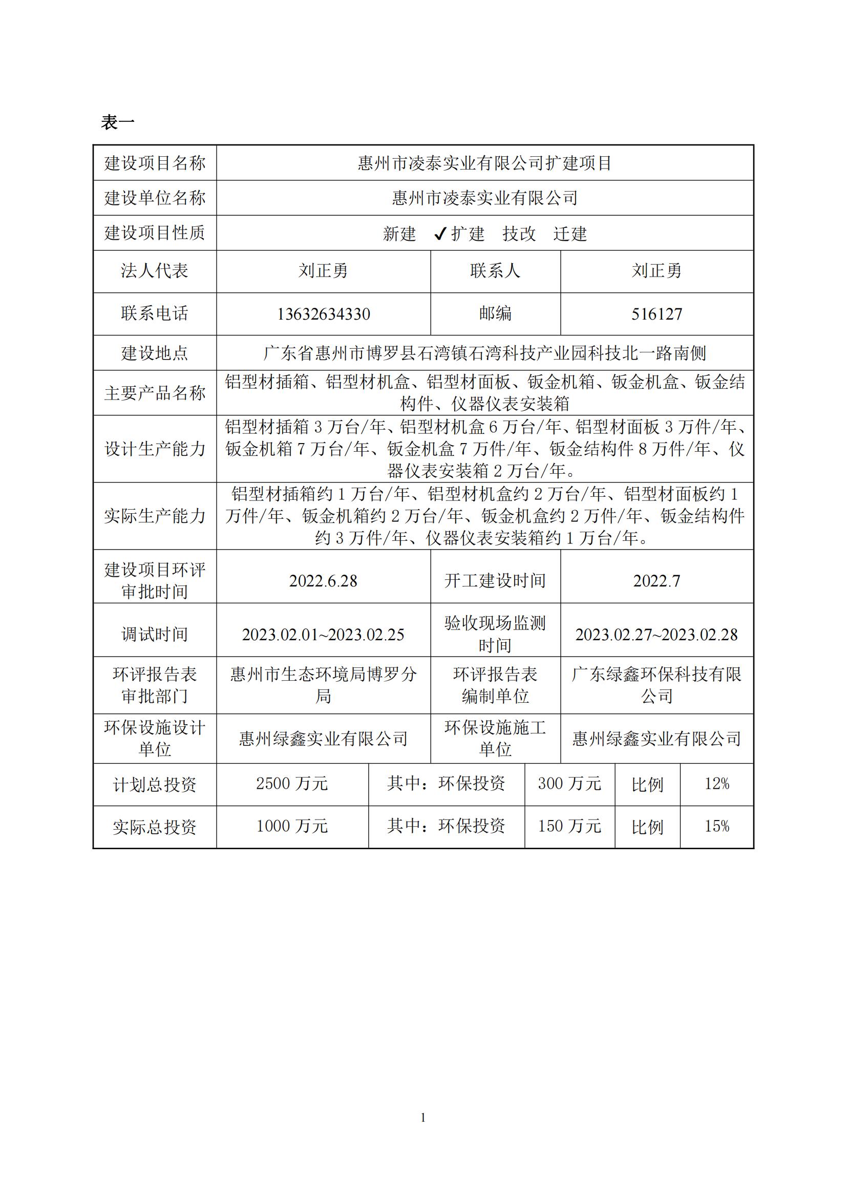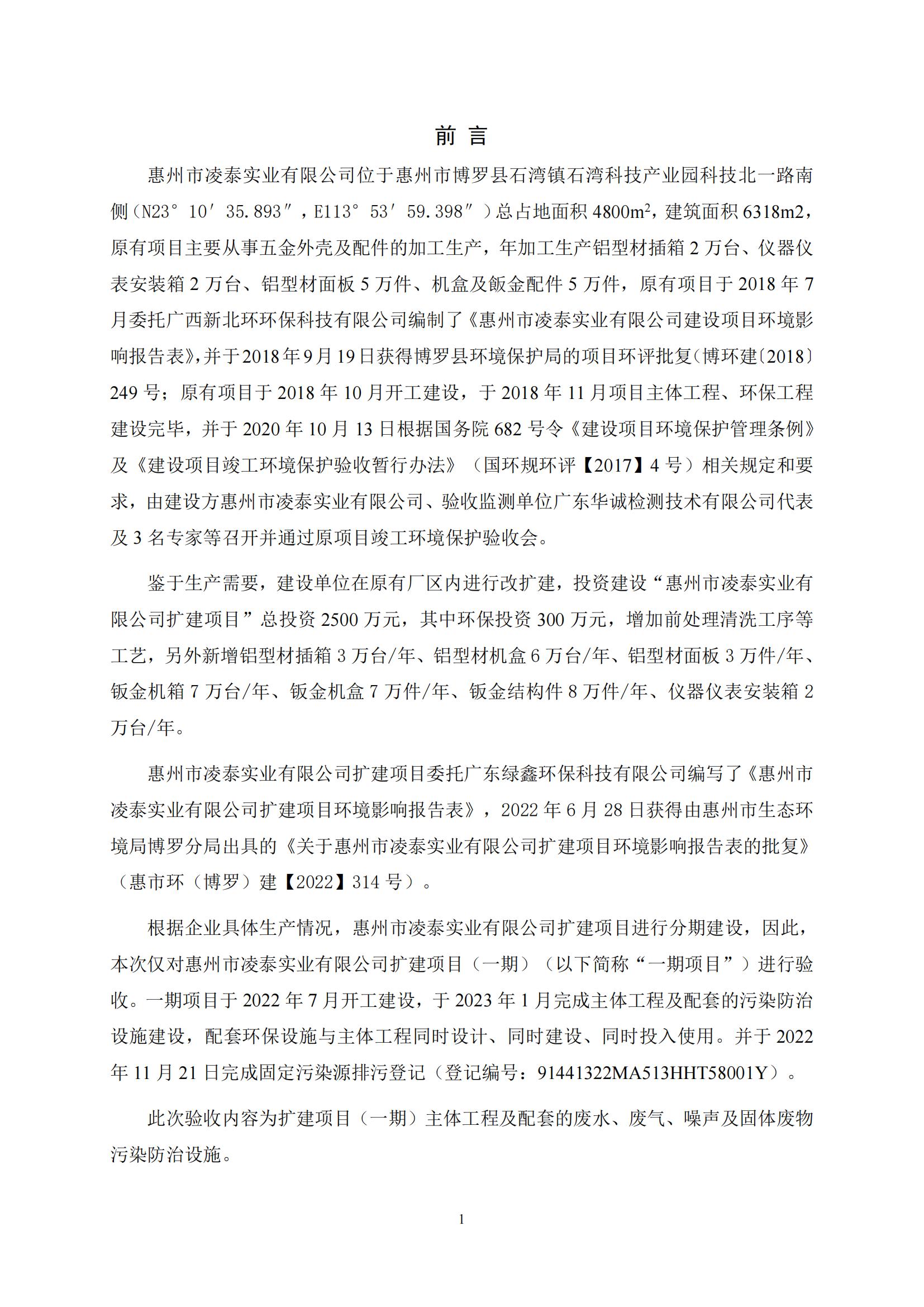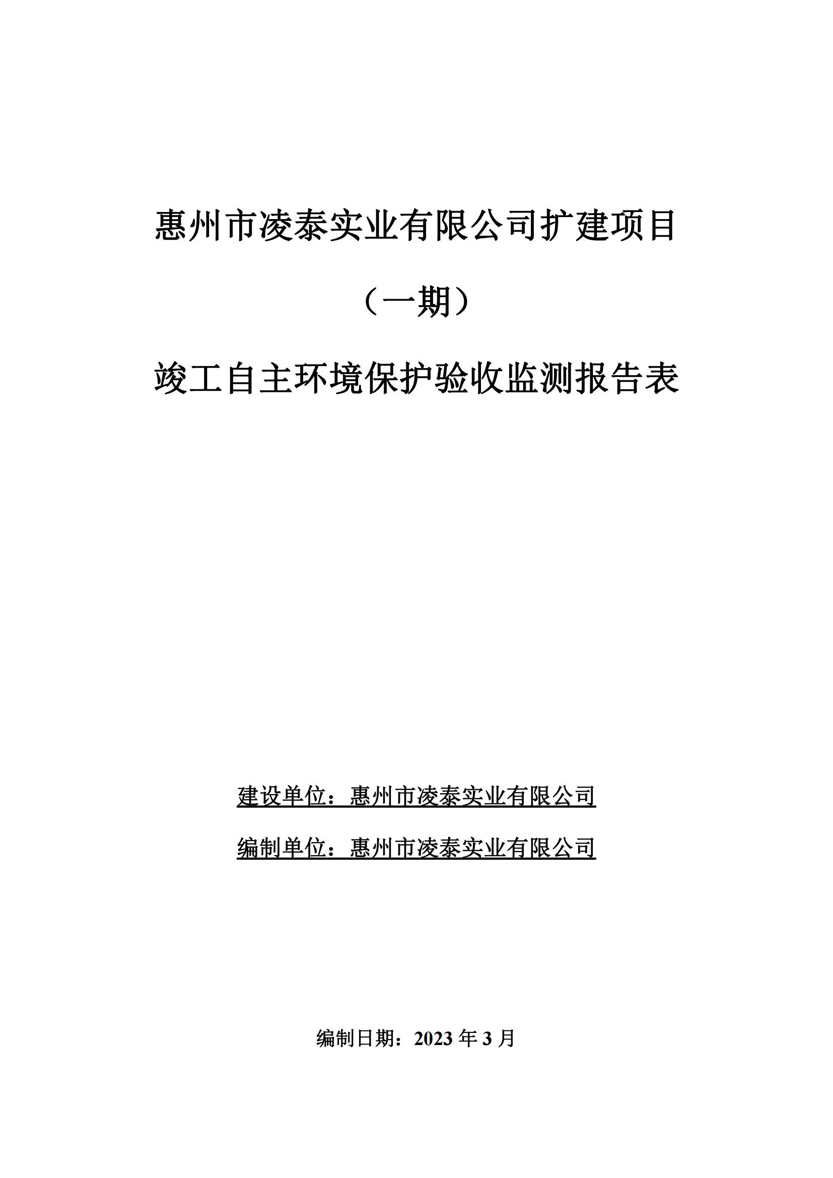 惠州市凌泰实业有限公司扩建项目 (一期) 竣工自主环境保护验收监测报告表