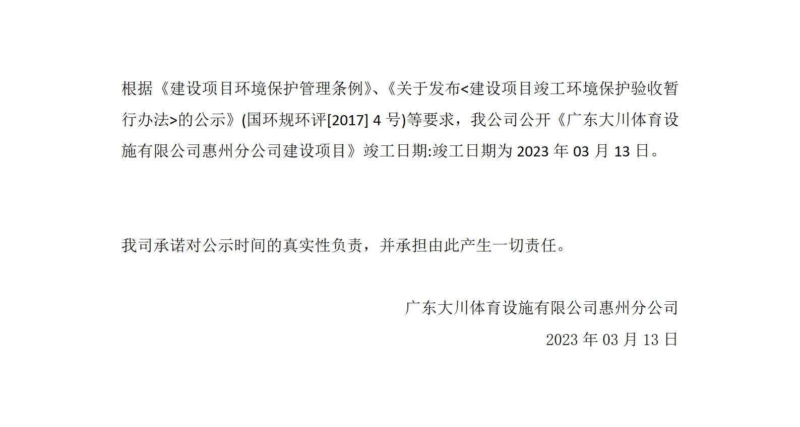 广东大川体育设施有限公司惠州分公司建设项目一期竣工时间公示
