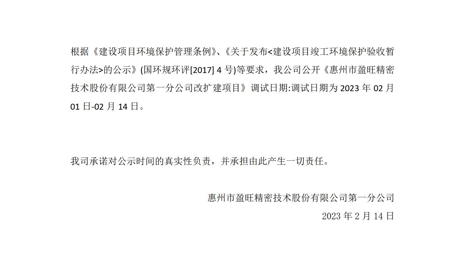 惠州市盈旺精密技术股份有限公司第一分公司改扩建项目调试时间公示