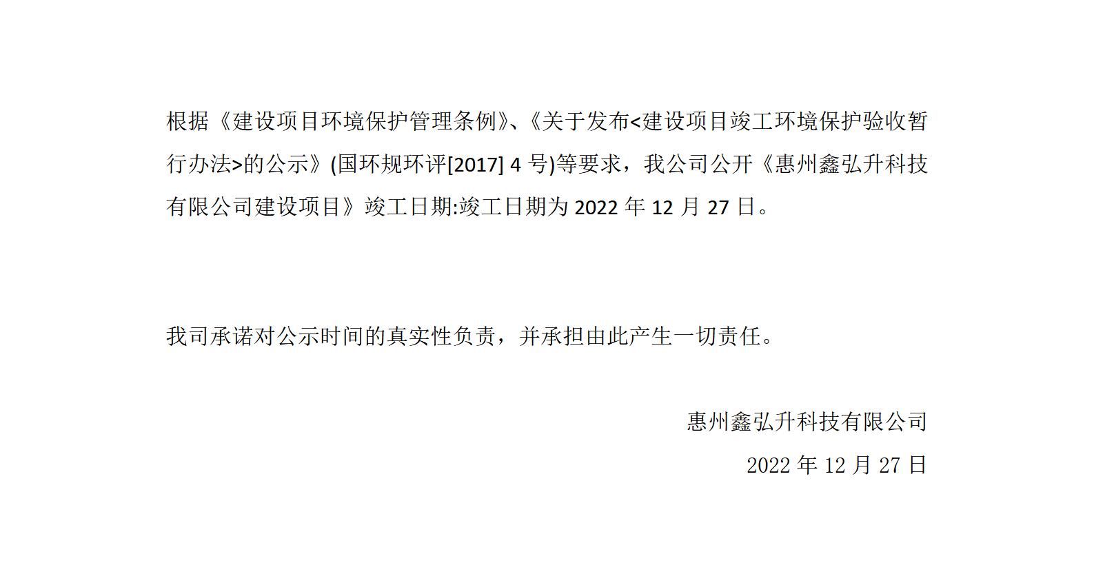 惠州鑫弘升科技有限公司建设项目一期竣工时间公示