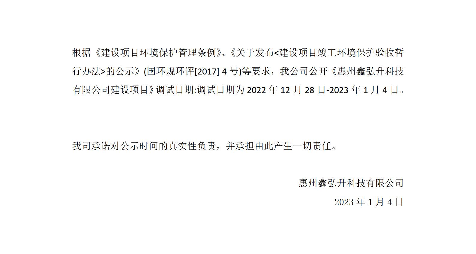 惠州鑫弘升科技有限公司建设项目一期调试时间公示