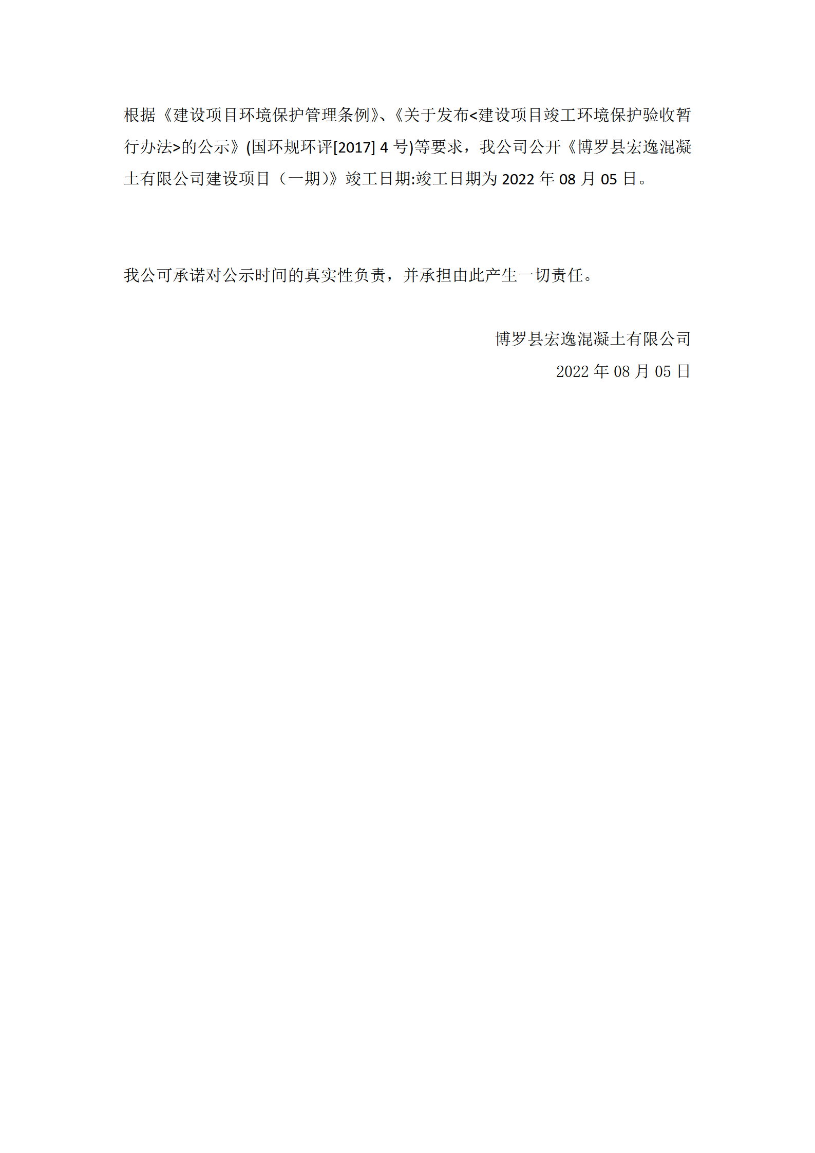 博罗县宏逸混凝土有限公司建设项目一期竣工时间公示